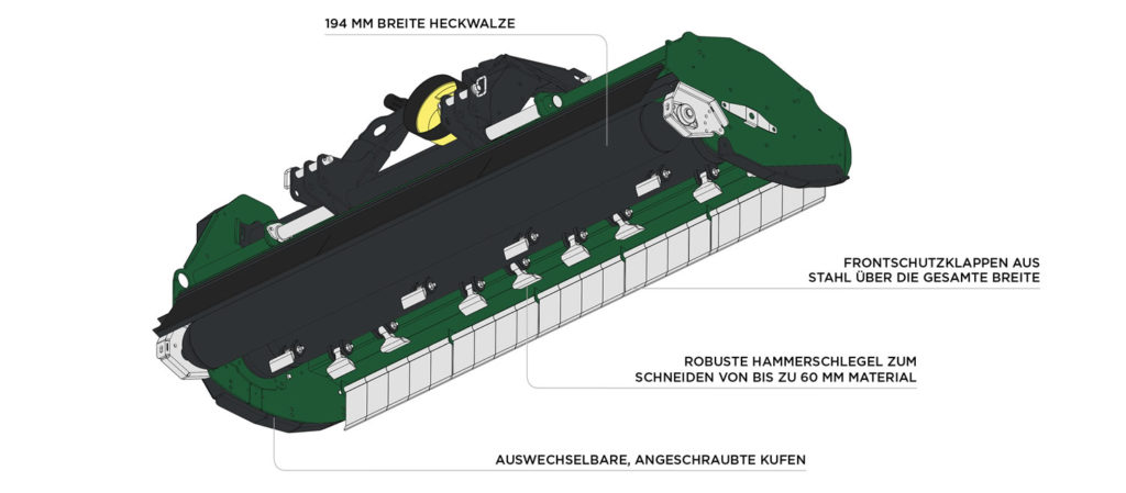 This robust machine features heavy duty hammer flails fitted in a double helical pattern on an electronically balanced rotor mounted on enclosed, self-aligning bearings. Belt drive gives reliable power transmission and a 194mm full width self-cleaning rear roller with scraper and rubber flap will ensure a quality cut and well distributed finish.
